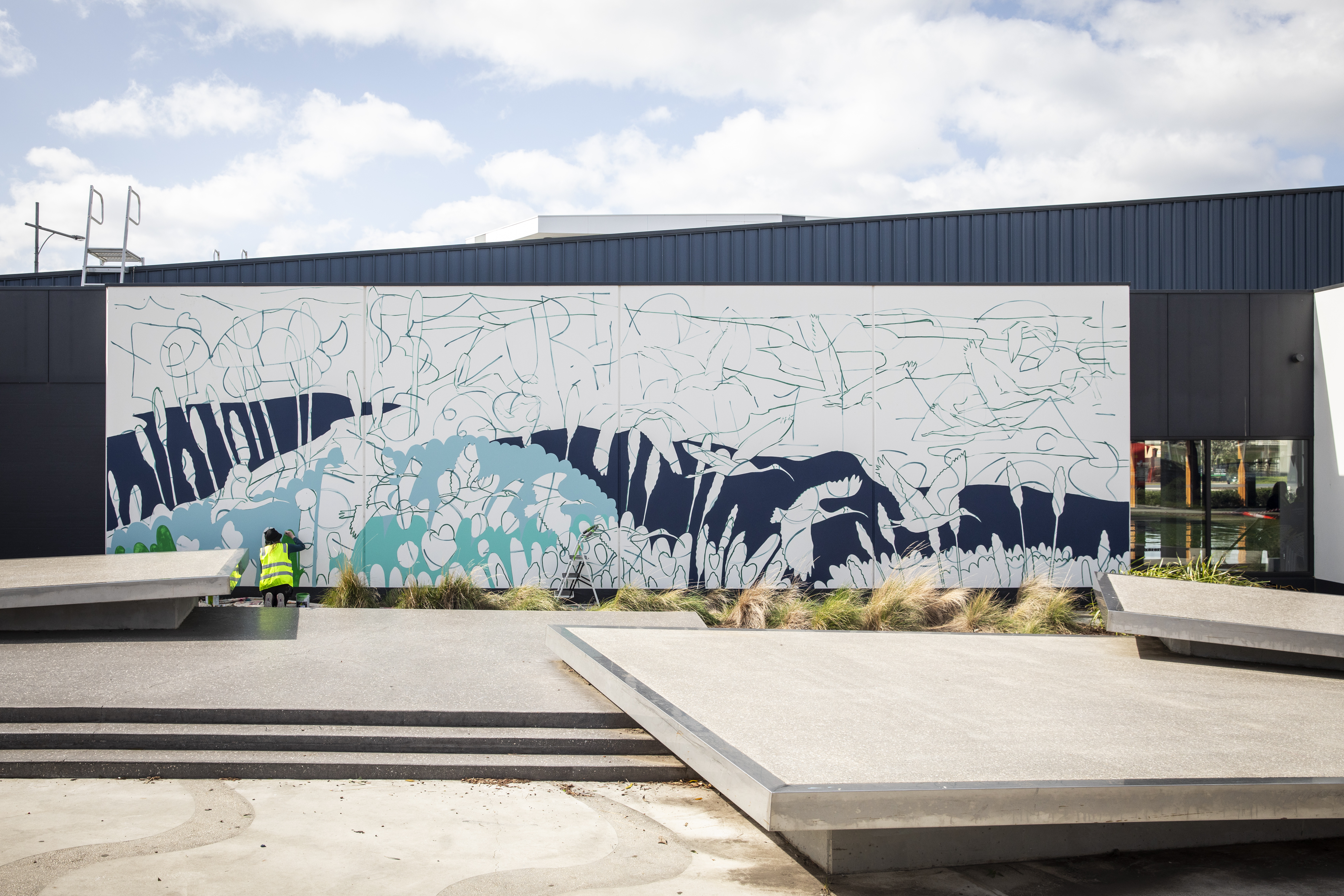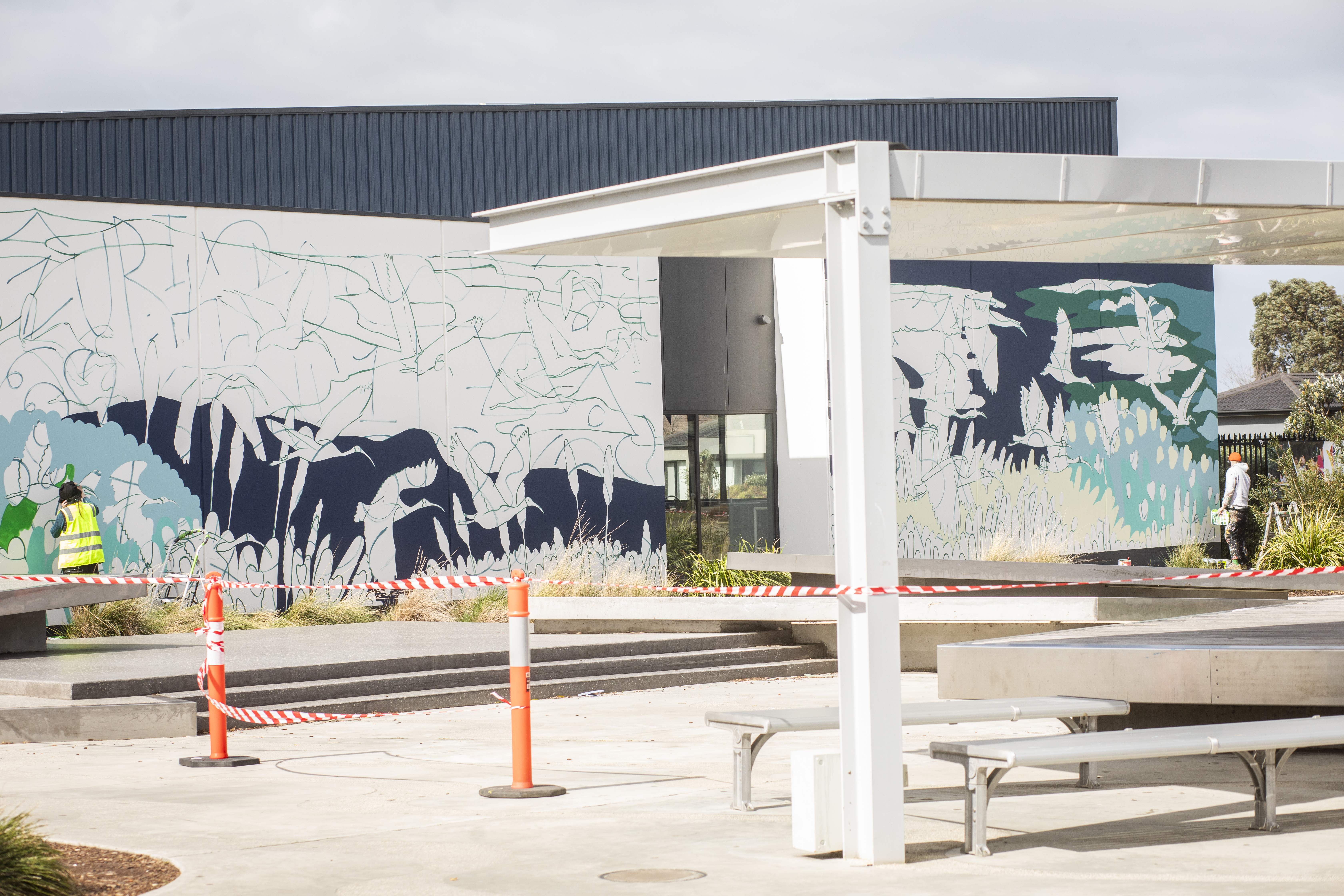 A new mural titled ‘Wings Over Saltwater Wetlands’ at Saltwater Swim School, Point Cook, is created by local artist Sasha Heath, also known as Hellotomato. The artwork spans two large walls on the west-facing facade of the building.