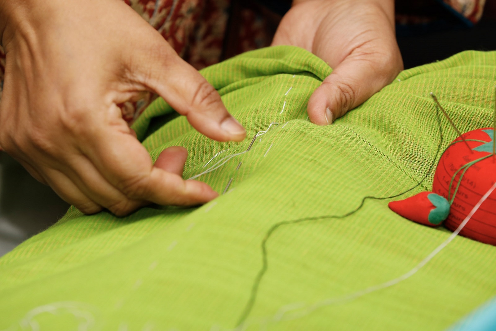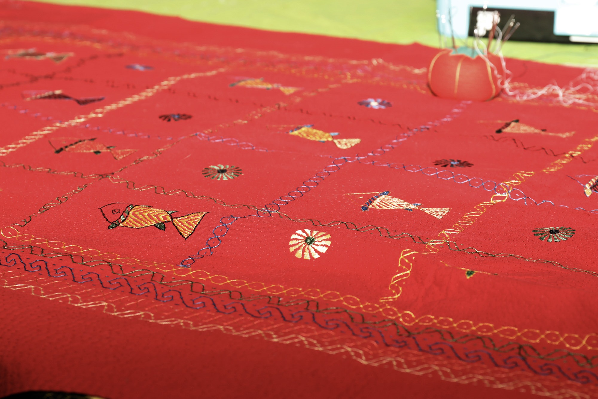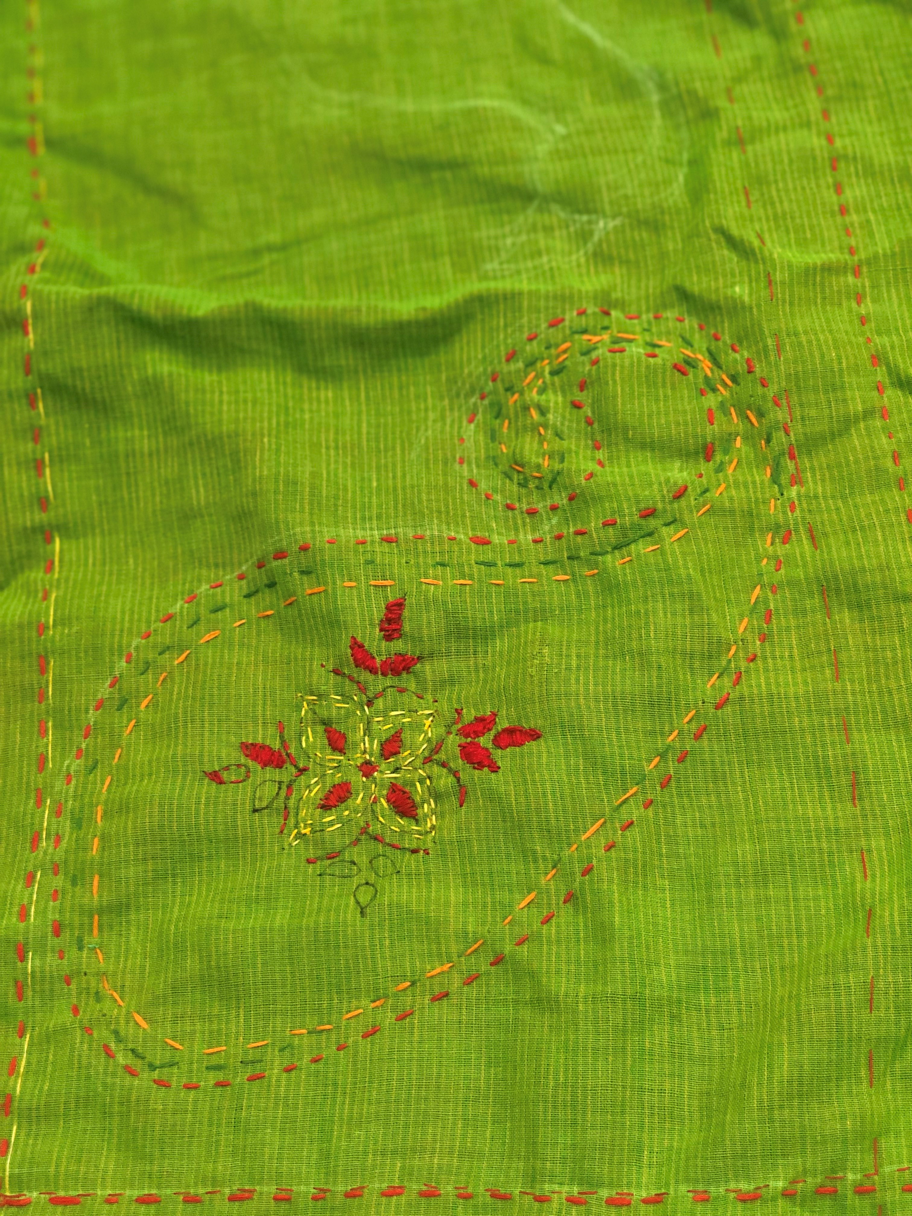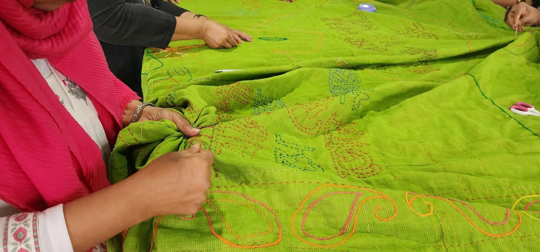 Making a Katha is a long, slow, laboursome process that often involves a group of women meeting regularly to create beautiful embroidery with repetitive running stitches.