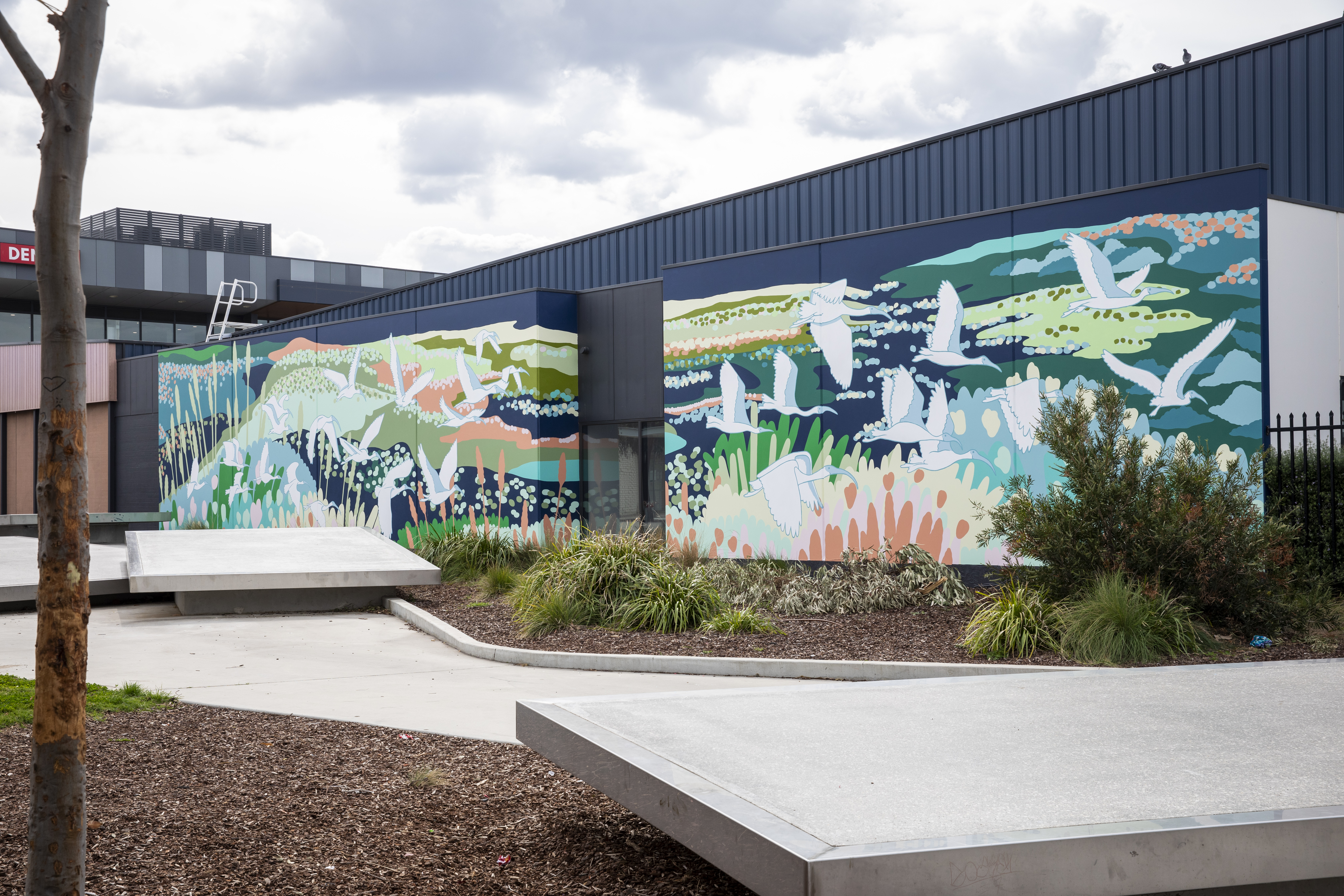 ‘Wings Over Saltwater Wetlands’ captures the vibrant colours and unique features of the local wetlands, highlighting the common sight of ibis in flight. By introducing greenery and natural elements, Sasha’s design transforms this blank canvas into a serene and inviting space. The rich hues add a calming atmosphere where people can relax and reflect. Serving as a visual landmark, the mural showcases the vibrancy and natural beauty of the local wetlands, bringing to life a lively scene that celebrates the diverse colours and native elements of the area.